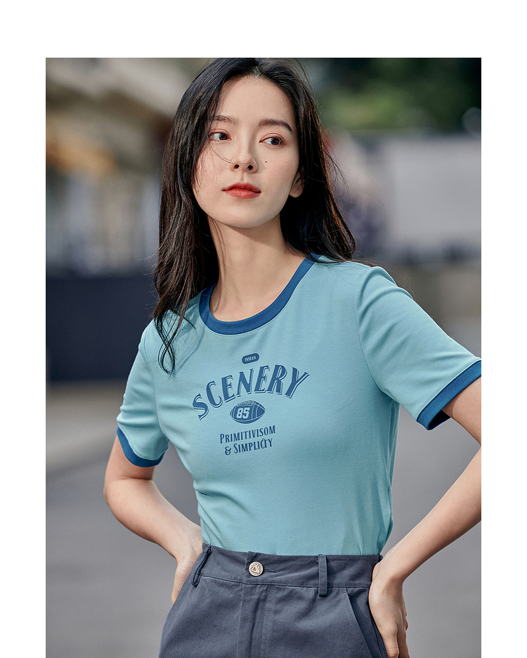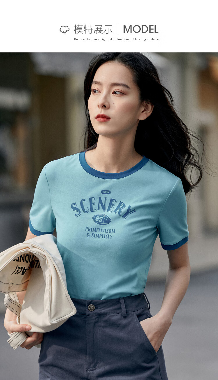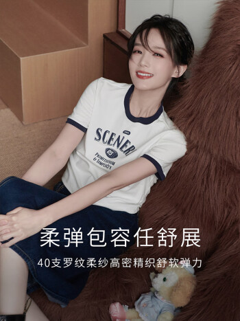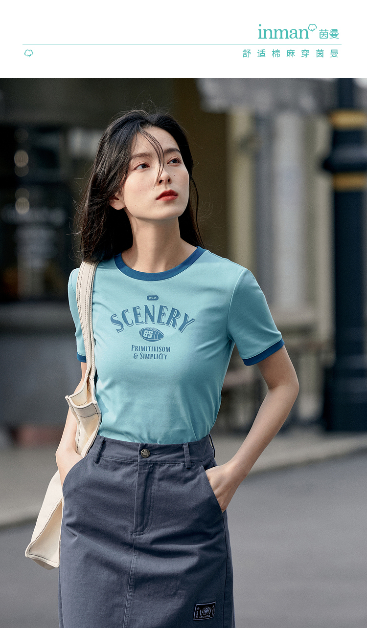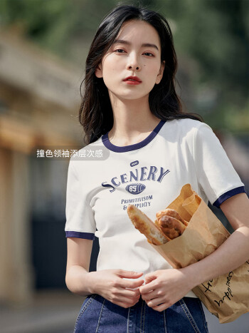 茵曼印花圆领T恤女夏季新款套头潮趣修身显瘦短款短袖上衣 月牙白 M