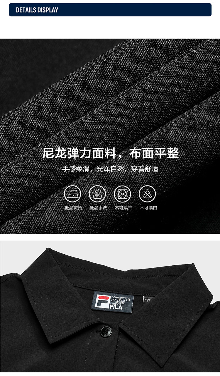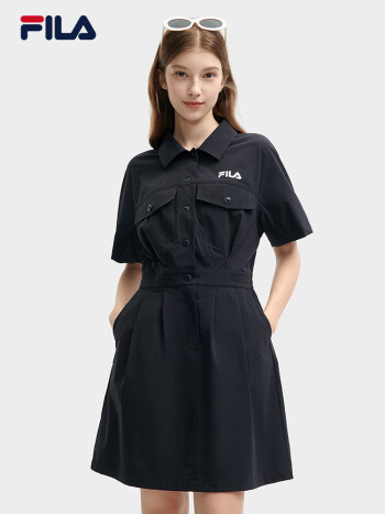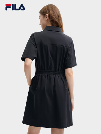 FILA 斐乐官方女子梭织连衣裙2024夏季新款时尚宽松翻领收腰裙子 正黑色-BK 170/88A/L